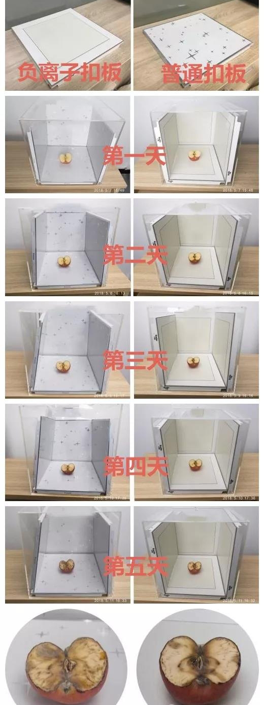 巴迪斯曾經(jīng)用蘋(píng)果做過(guò)一次試驗(yàn),分別用普通扣板和負(fù)離子扣板將蘋(píng)果隔離,觀察他們的氧化情況: