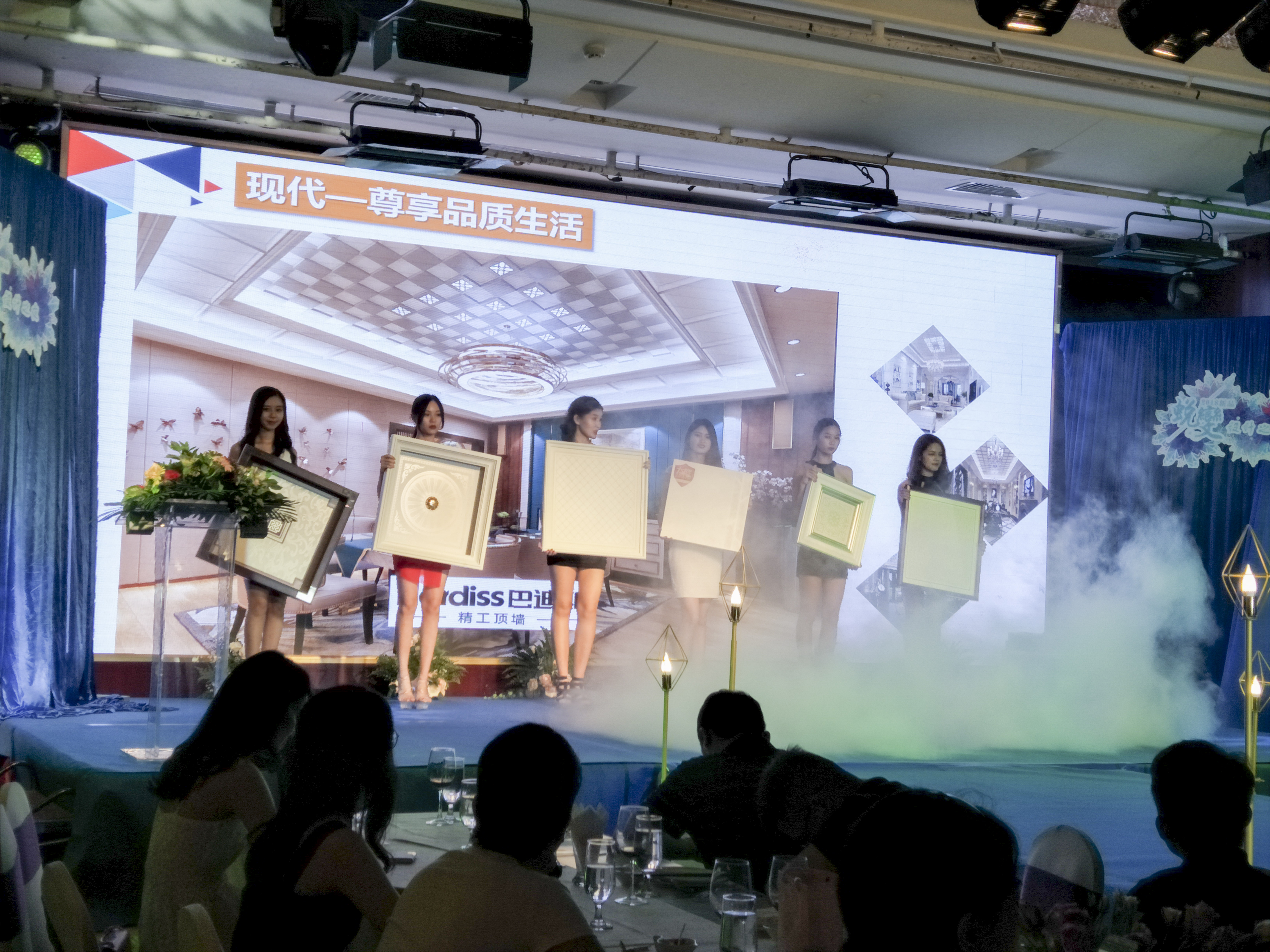 清遠巴迪斯全屋精工吊頂、蒙娜麗莎瓷磚、伊元素背景墻、佳櫥維思櫥柜、德水凈水五家行業頂尖品牌作為本次夜宴的主辦方,向在場的來賓闡述了產品效果圖的設計理念,并通過模特走秀的形式展示了各自的產品,獲得了現場來賓的熱烈好評,并征服了一批家裝公司。