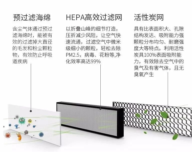 集預過濾海綿、HEPA高效過濾網、活性炭三層濾網,將空氣中大到灰塵細屑、小到分子級別的甲醛、毒害物質隔除在外,為您的生活帶來源源不斷的潔凈體驗,實驗證明,三重過濾,絕對安全可靠,見下圖: